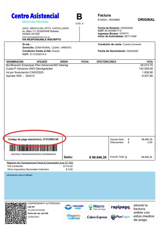 Ingresá a centroasistencial.com.ar/pay colocá el código electrónico de pago (ver muestra). Luego elegí como pagar. Entre las opciones podés optar hacerlo con tarjeta de Débito o Código QR. En este ultimo caso, escaneá el QR y elegí pagar a través de una aplicación bancaria o billetera virtual de tu preferencia.